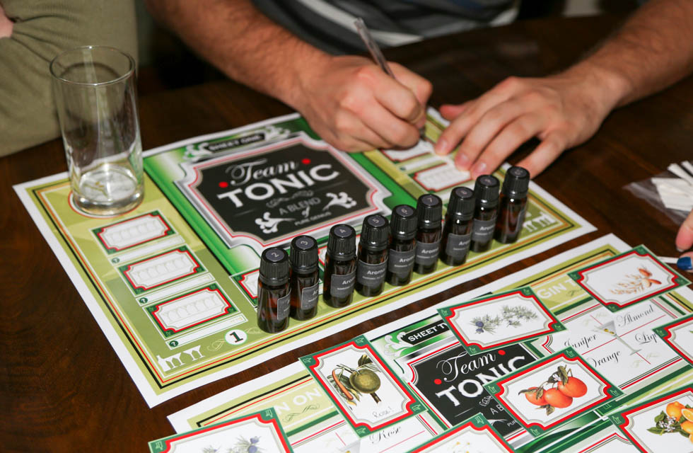 Teams receive game rules and a box of aroma bottles. Participants sniff for botanicals and sip the gins in an attempt to identify each sample in the box.